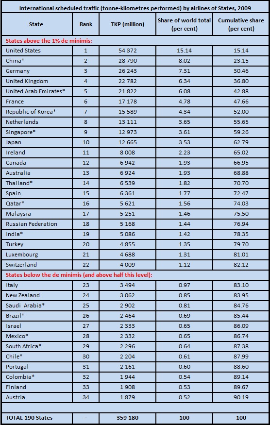 The airlines of the 22 countries above the threshold represent no less than 82 per cent of world international scheduled traffic (and with the other 19 EU countries nearly 87 per cent). When including non-scheduled traffic this figure would be further increased, if marginally – European countries amongst the 22 are the primary source of non-scheduled traffic, which represents about 7 per cent of total traffic. The above threshold figures compare very favourably with the 59 per cent of world international traffic by the airlines of all Annex I States or the estimated 60 percent covered by the European ETS. The inclusion of the United States (which did not ratify the Kyoto Protocol), China and some other non-Annex I States amongst the 22 above the threshold is undoubtedly a coup for ICAO.