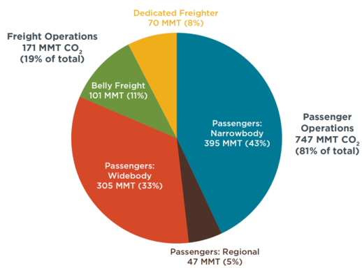 Global CO2 emissions in 2018 by operations and aircraft class (source: ICCT):
