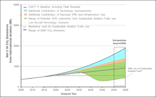 Projected net CO2 emissions from international aviation 2005-2050, including SAF life cycle CO2 emissions reductions (source: ICAO):